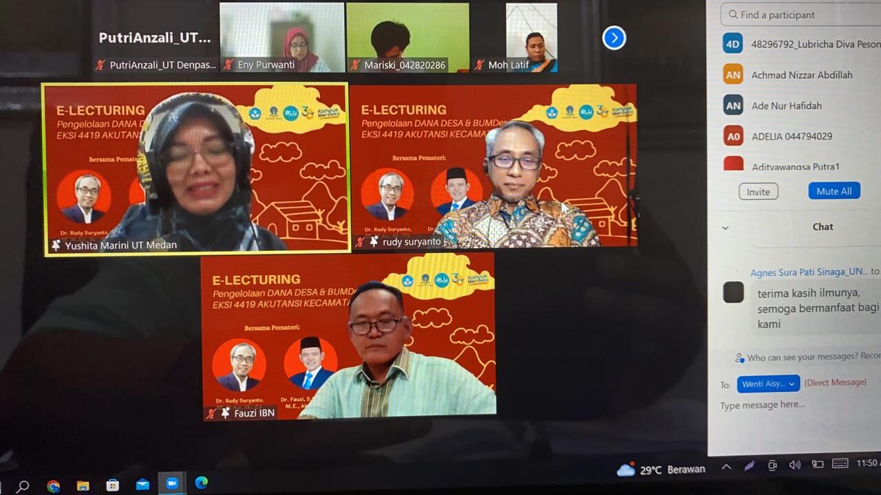 Lampung, 15/10/2022 – Institut Bakti Nusantara (IBN) kembali menorehkan kontribusi dalam pengembangan keilmuan nasional melalui partisipasi Rektor IBN, Dr. Fauzi, M.Kom., M.E., Ak., CA, sebagai narasumber pada kegiatan Seminar E-Lecturing Akuntansi Sektor Publik yang diselenggarakan oleh Universitas Terbuka secara daring melalui Zoom Meeting. Kegiatan ini mengangkat tema “Pengelolaan Dana Desa dan BUMDes yang Transparan dan Akuntabel” serta menghadirkan narasumber lain, Dr. Rudy Suryanto, yang juga merupakan pakar di bidang keuangan publik dan tata kelola desa.