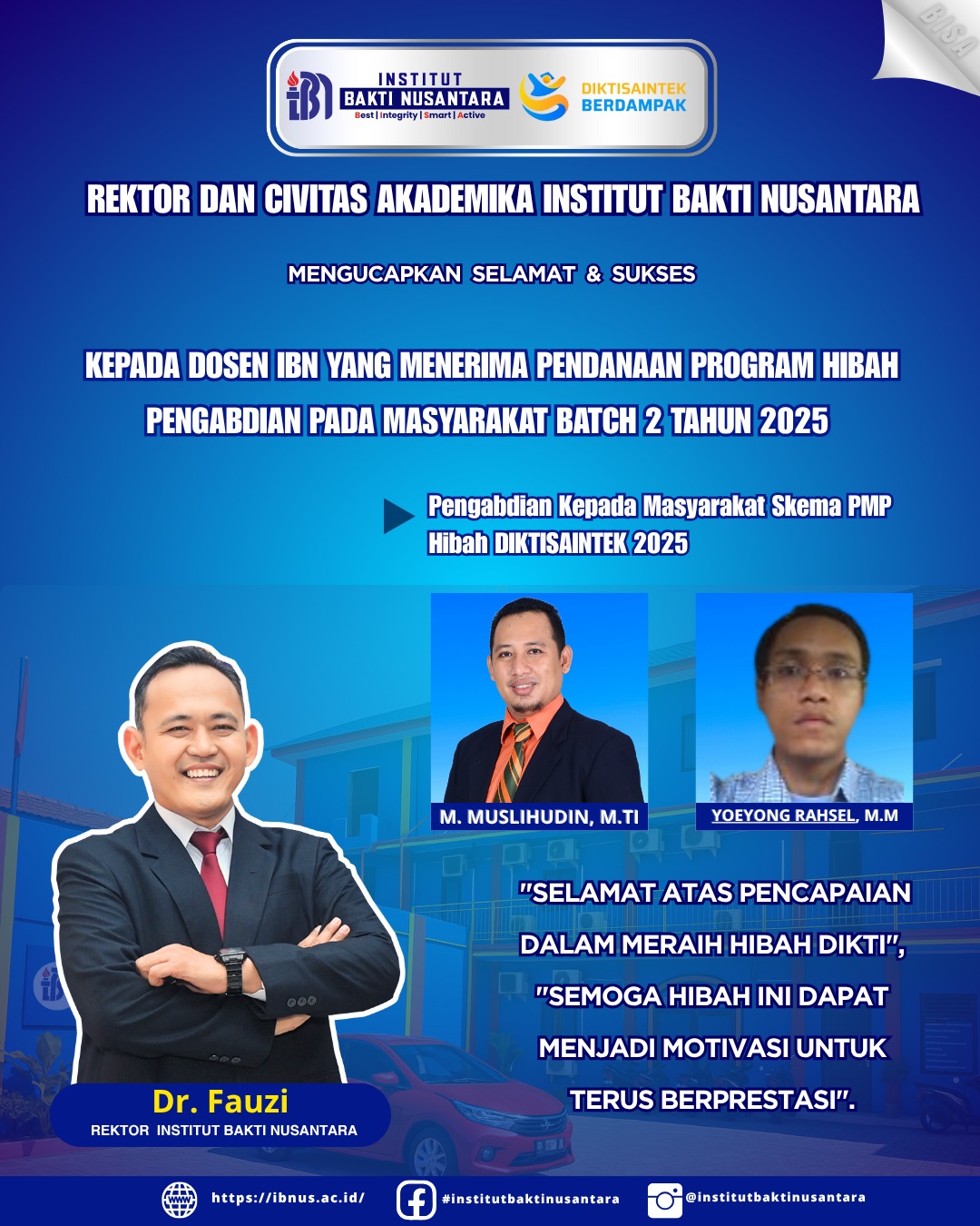 Lampung, 23 Juli 2025 — Prestasi membanggakan kembali ditorehkan oleh Fakultas Teknologi dan Ilmu Komputeri (FTIKOM) Institut Bakti Nusantara (IBN). Dua proposal Pengabdian kepada Masyarakat yang diajukan oleh dosen FTIKOM berhasil lolos pendanaan dari Kementerian Pendidikan Tinggi, Sains, Dan Teknologi Direktorat Jenderal Riset Pengumuman berdasarkan surat nomor 0511/C3/AL.04/2025 tentang Penerima Pendanaan Program Pengabdian kepada Masyarakat Batch II Tahun Anggaran 2025.