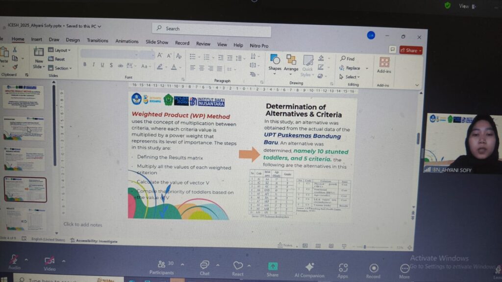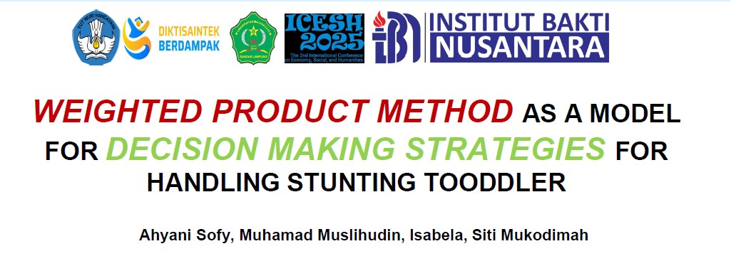 Dalam persentasinya Ahyani Sofy memaparkan penelitian yang berjudul Weighted Product Method as a Model for Decision Making Strategies for Handling Stunting Toddlers, dalam paparanya penelitian ini menggunakan Metode Weighted Product (WP) dengan tujuan menentukan prioritas penanganan balita stunting. Penilaian dilakukan kepada 10 alternatif berdasarkan 5 kriteria seperti: status gizi (BB/U), pertumbuhan fisik (TB/U), usia, asupan vitamin A, dan lingkar lengan atas (LiLA). Berdasarkan hasil akhir dan analisis sensitivitas, metode Weighted Product direkomendasikan sebagai metode unggulan dalam penelitian ini. Hal ini didasarkan pada keunggulan WP dalam mempertahankan kestabilan peringkat secara keseluruhan dan ketahanannya terhadap variasi bobot, yang krusial dalam konteks penerapan sistem pendukung keputusan (SPK) di dunia nyata yang berubah-ubah.