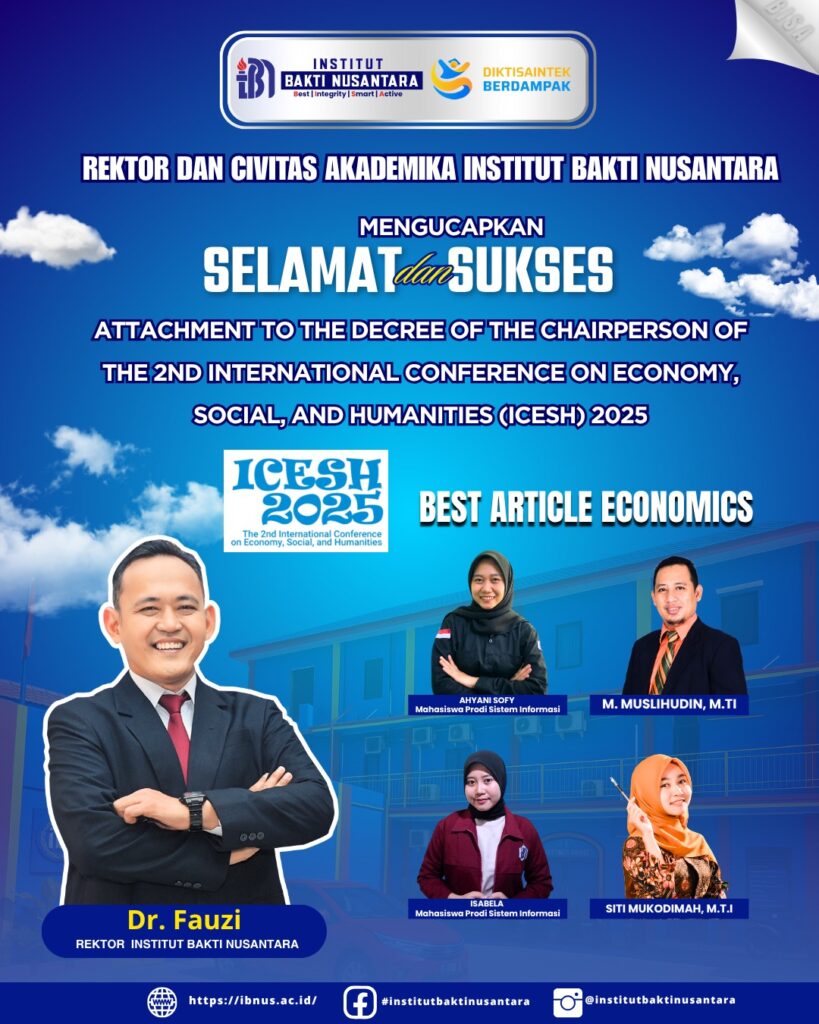 Bandar Lampung, Institut Bakti Nusantara kembali mencatatkan prestasi akademik membanggakan di tingkat internasional. Mahasiswa program studi Sistem Informasi berhasil meraih penghargaan Best Article dalam ajang International Conference on Economy, Social, and Humanities (ICESH) 2025, yang berlangsung pada tanggal 28–29 Juli 2025 di Universitas Malahayati, Bandar Lampung.