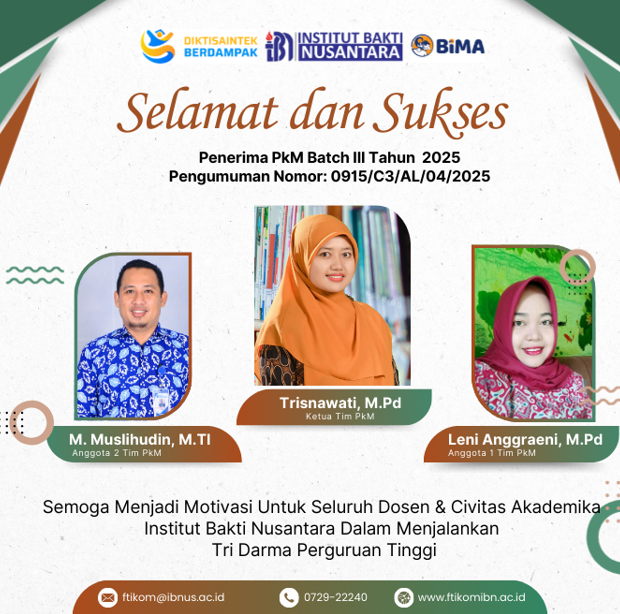 Lampung, 8 September 2025 – Institut Bakti Nusantara (IBN) kembali mencatat prestasi membanggakan di tingkat nasional. Berdasarkan Kementerian Pendidikan Tinggi, Sains, Dan Teknologi Direktorat Jenderal Riset Dan Pengembangan nomor 0915/C3/AL/04/2025 tanggal 7 September 2025, tim dosen IBN berhasil lolos sebagai penerima pendanaan Program Pengabdian kepada Masyarakat Skema Pemberdayaan Berbasis Masyarakat Batch III Tahun Anggaran 2025.