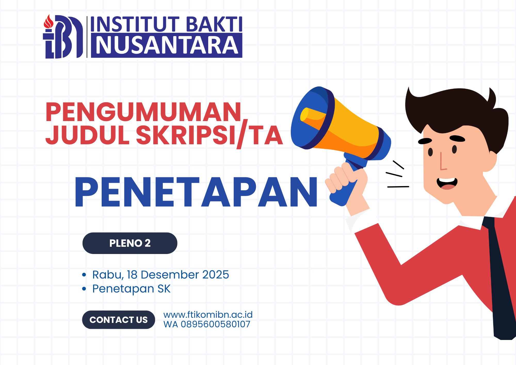 Sehubungan dengan telah dilaksanakannya proses pengajuan, seleksi, dan evaluasi judul Skripsi dan Tugas Akhir oleh mahasiswa, bersama ini Program Studi mengumumkan bahwa judul Skripsi dan Tugas Akhir mahasiswa telah ditetapkan. Mahasiswa yang judulnya telah ditetapkan wajib melaksanakan proses bimbingan Skripsi atau Tugas Akhir sesuai dengan ketentuan akademik, serta mematuhi jadwal dan peraturan yang ditetapkan oleh Program Studi dan Fakultas. Judul yang telah disahkan tidak dapat diubah tanpa persetujuan resmi dari Program Studi.