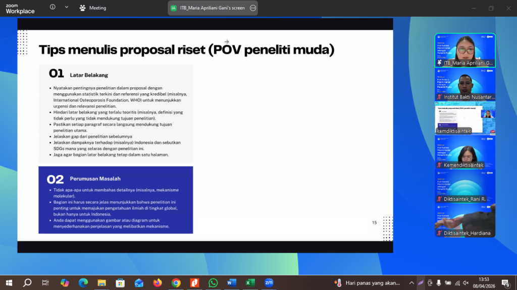 Pringsewu (08/04/2026) – Dosen Institut Bakti Nusantara (IBN) kembali menunjukkan komitmennya dalam pengembangan kapasitas akademik dengan mengikuti kegiatan bertajuk “Kiat Sukses Meniti Karier sebagai Peneliti Muda” yang diselenggarakan oleh Direktorat Bina Talenta Penelitian dan Pengembangan di bawah naungan Direktorat Jenderal Riset dan Pengembangan.